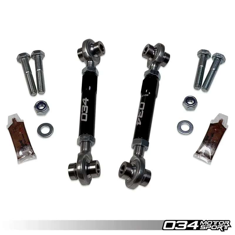 Тези биалетки позволяват безкомпромисно прехвърляне на движението на окачването към стабилизиращата щанга и са с регулируема дължина, което позволява елиминирането на предварителното натоварване на щангата. Биалетките на 034Motorsport са единствените опции на пазара със сферични накрайници с голям ъгъл на отклонение, гарантиращи, че биалетките няма да блокират при артикулацията на окачването.
