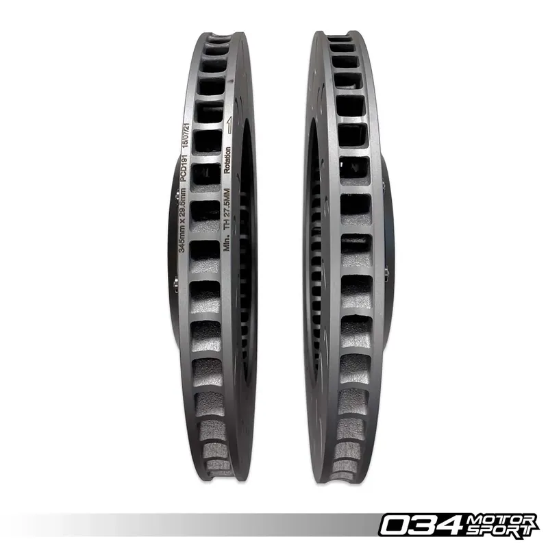 Централната част (шапката) на диска на 034Motorsport е изработена от алуминий 6061-T6 с авиационни спецификации. Пръстенът е конструиран от патентована метална сплав, която може да издържи на огромни спирачни температури, запазвайки формата си. Фабрично един и същ диск с прави канали се използва и от двете страни на S4. Продуктите на 034Motorsport използват 72 насочени извити лопатки, за да осигурят принудителен поток от студен въздух през диска за разсейване на топлината. Те са специфични за лявата и дясната ос, за да осигурят значително увеличение на ефективността на охлаждане спрямо фабричния дизайн.