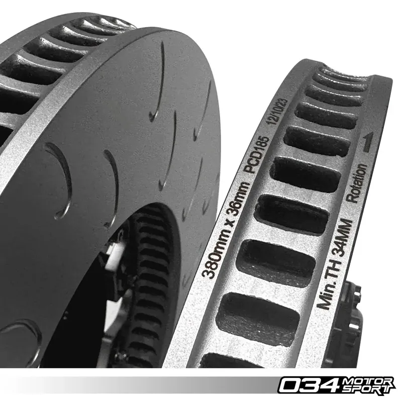 Централната част на диска на 034Motorsport е изработена от алуминий 6061-T6 с авиационни спецификации. Пръстенът е конструиран от патентована метална сплав, която може да издържи на огромни спирачни температури, като същевременно запазва формата си. Това позволява интензивна улична употреба и дълги дни на пистата, позволявайки шофиране вместо работа по автомобила. Фабрично един и същ диск се използва от двете страни на SQ5, което води до неправилно вентилиране и охлаждане на едната страна. Комплектът за надграждане на двукомпонентни плаващи предни спирачни дискове на 034Motorsport използва 72 насочени извити лопатки, правилно ориентирани за всяка страна на автомобила, за да осигурят принудителен поток на студен въздух през двата диска и да разсейват топлината еднакво.