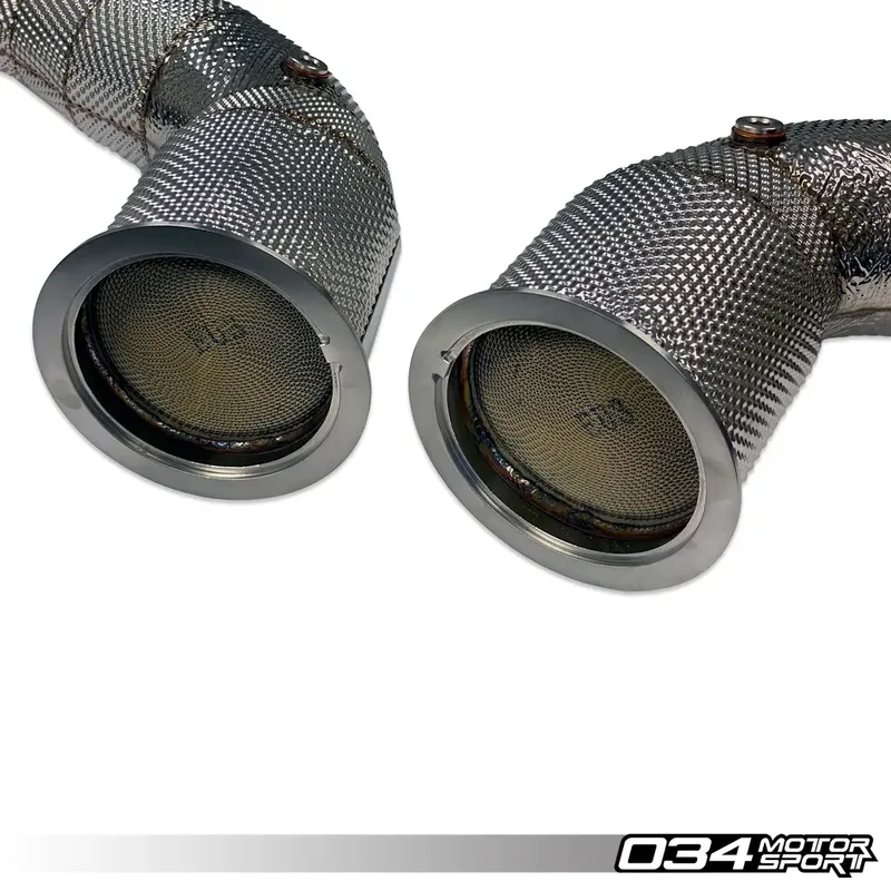 Оптимизиран за повишен поток и максимална производителност, комплектът спортни катализатори разполага с два масивни Euro3 състезателни катализатора на оригиналните места. Това цялостно решение за директен монтаж включва интегриран v-band фланец на изходите на турбината, интегрирано гнездо за ламбда сонда след катализаторите, интегрирани фланци за даунпайп с 3 болта и пълен комплект гарнитури и хардуер за прецизно пасване и лесна инсталация. Спортните катализатори на 034Motorsport за Audi RS5 са изработени от неръждаема стомана 304 за максимална издръжливост и устойчивост на корозия, TIG заварени са и включват интегрирана термоизолация в оригинален стил за минимизиране на топлината, пренасяна в двигателния отсек.