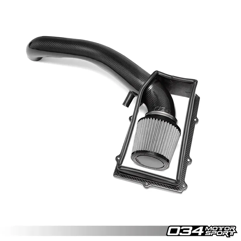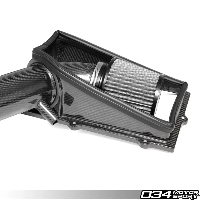 Инженерите на 034Motorsport положиха значителни усилия, за да разработят цялостно решение за всмукателната система за първото поколение 8V Audi RS3 (с чугунен блок), което да носи предимства в мощността и въртящия момент спрямо добре проектираната фабрична кутия. Резултатът е тази красиво изработена карбонова всмукателна система.