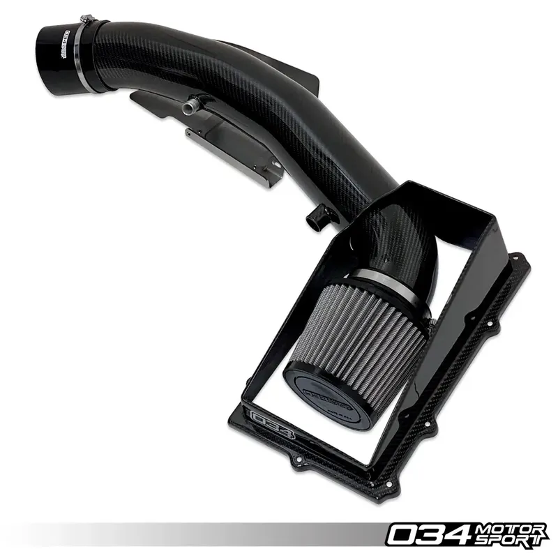 Инженерите на 034Motorsport положиха големи усилия, за да разработят решение за студен въздух за TTRS и RS3, което носи предимства пред добре проектираната фабрична кутия, което в крайна сметка доведе до тази красиво изработена 4-инчова карбонова всмукателна система с отворен капак.
