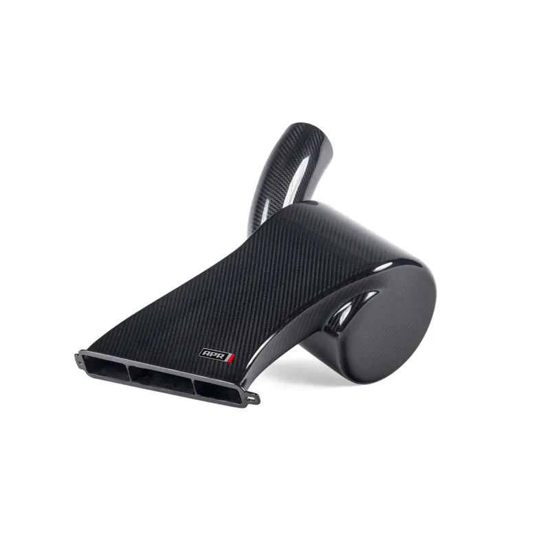 Въздухът изминава кратък път през всмукателната система, покрай филтъра и към турбокомпресора през затворен дизайн, който предотвратява поглъщането на горещ въздух от двигателния отсек. И накрая, карбоновата композитна конструкция включва тънка подложка от фибростъкло, която подобрява термално-изолационните свойства. Забележка: За разлика от много дизайни на всмукателни системи с пълен преден въздухозаборник, системата на APR НЕ блокира фабричния канал за охлаждане на двигателя, намиращ се на противоположната страна.