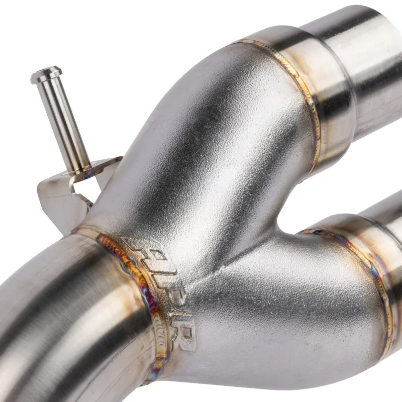Задният разпределител е лят, за да се максимизира производителността на системата чрез поддържане на висока скорост на изгорелите газове и ниско обратно налягане. Това се постига чрез постепенно разделяне на системата от единична 76 мм тръба към двойни 63.5 мм тръби. Органично оформената отливка позволява този преход да се извърши плавно, за да не се нарушава потокът на газовете.