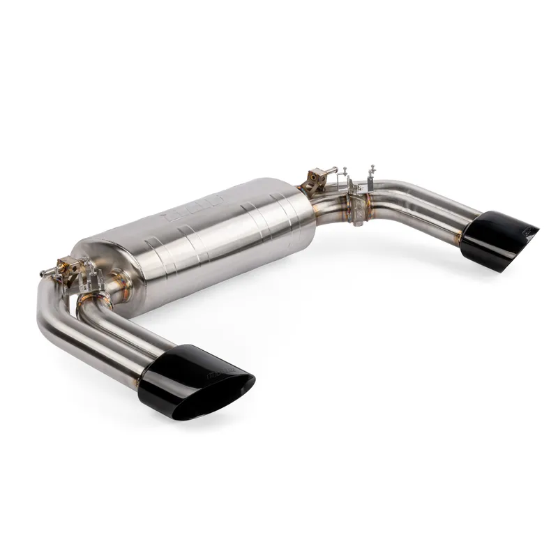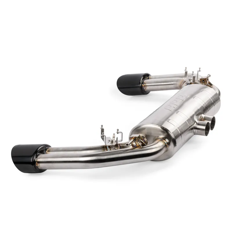 Двойните 63.5 мм тръби, огънати чрез дорник, осигуряват ултрагладък път, отвеждайки газовете навън през системата с четири изхода, като същевременно изглеждат подредени под задната броня. Корпусите на клапаните на APR позволяват на автомобила да бъде оборудван с фабричните електронни задвижващи механизми, запазвайки OEM работата на клапаните за променливи нива на звука. Накрая, овалните накрайници с диамантено черно покритие и размери 170×112 мм завършват системата, добавяйки елегантен щрих, вдъхновен от RS моделите, в задната част на превозното средство.